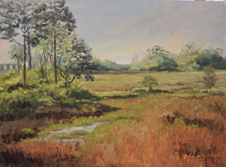 Every morning I walked on a boardwalk at our hotel to cross this marsh to get out to the ocean. The boardwalk was wide enough for me to set up my easel out of the way of pedestrians. At times I did have some onlookers. They were all very respectful of my concentration and those that did speak were very polite and complimentary of my painting. Some even asked if they could take a photo of me painting! I guess I was the local entertainment for the day. The structures on the far distant left of my painting are the cabanas that were placed there by the hotel. The Atlantic Ocean is just on the other side of the distant tree line.